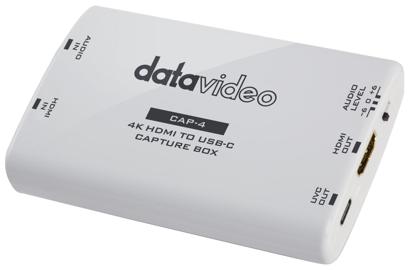 The Datavideo CAP-4 is a high-performance 4K HDMI capture device designed for professional video production, live streaming, and content creation. Supporting 4K 2160p at 50/60fps, it ensures the video with stunning clarity and detail. Equipped with USB-C 3.2 Gen 2 interface for high-speed data transfer, the CAP-4 offers plug-and-play simplicity across multiple operating systems. Its versatile audio mixing options allow seamless integration of HDMI-embedded and external line-in audio. Compact, powerful, and easy to use, the CAP-4 is the perfect choice for capturing high-quality video with minimal setup.