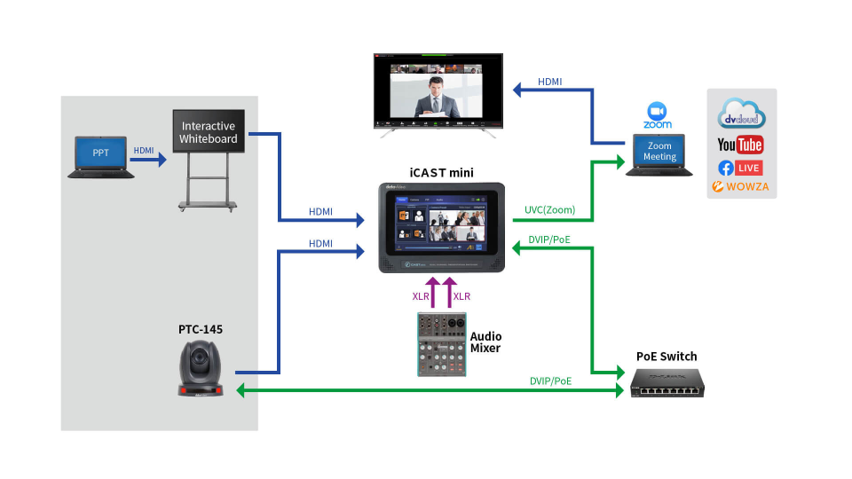 Introducing the PTC-145, a versatile PTZ camera designed for enhanced visual experiences. The 1/2.8” CMOS sensor delivers outstanding image quality with 20x optical zoom and 8x digital zoom. Offering HDMI, 3G-SDI, and streaming outputs, it connects to various devices with ease. Equipped with line-in and 3.5mm microphone inputs for exceptional audio quality. This camera features one-click AI Auto Tracking, enabling smooth camera movements without a dedicated operator. Simultaneous streaming to two platforms is effortless. The PTC-145 includes integrated NDI control functionality, providing enhanced flexibility and efficiency for modern live production environments. Available in stylish dark blue or white options, it complements indoor design preferences. Elevate your visual excellence with the PTC-145 camera.