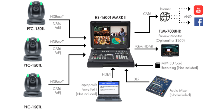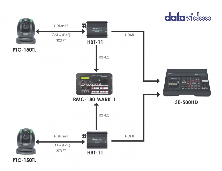 Rather than using one cable for video, a second cable for power, and a third cable for camera control, the PTC-150TL is able to do all of the above using a single ethernet cable. This model does not include the HBT-11 Receiver, but works with HS-1600T as-is. This increase in flexibility greatly reduces setup time, and now you can mount the camera in challenging locations (like spots with no power outlets nearby)